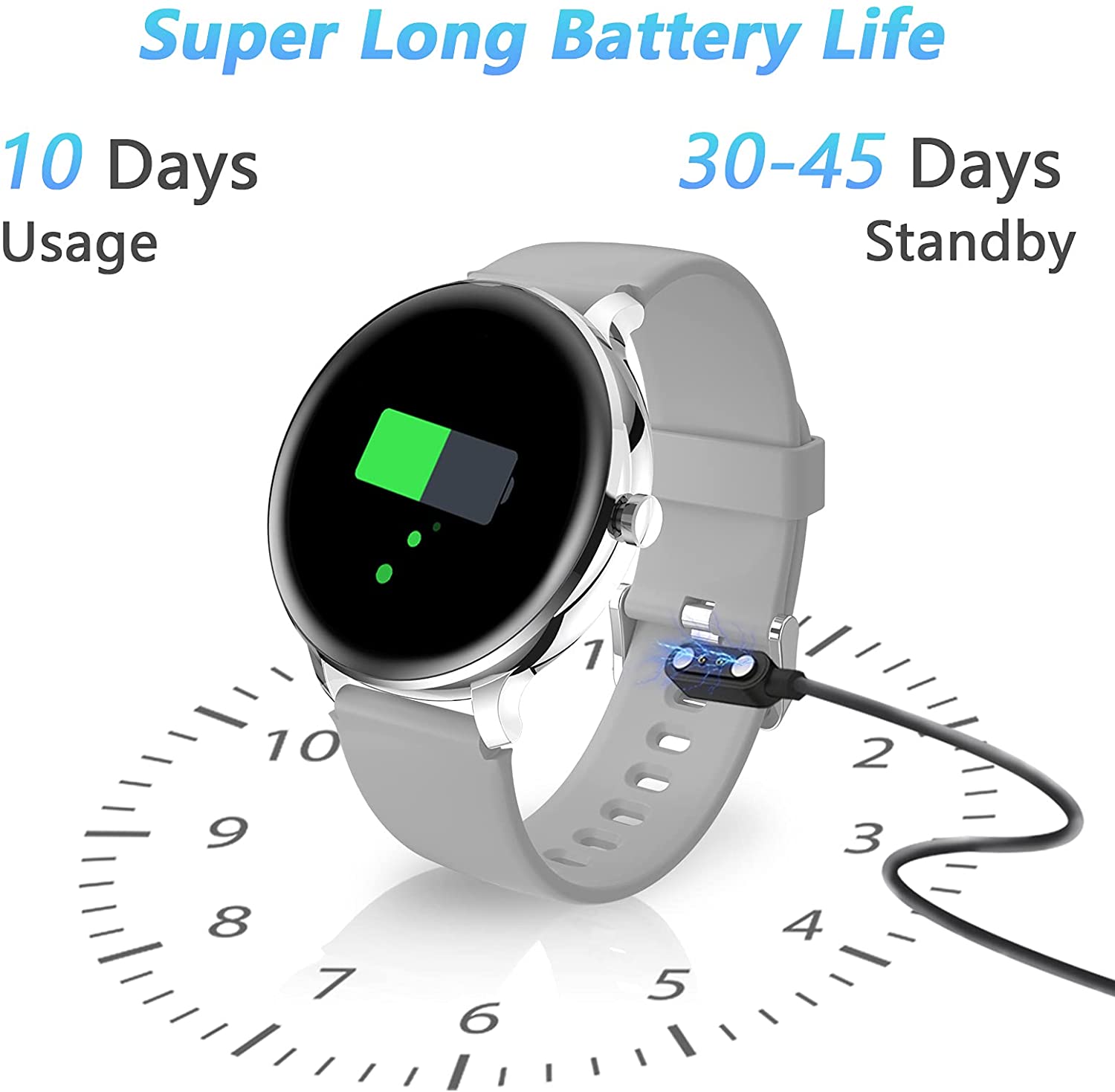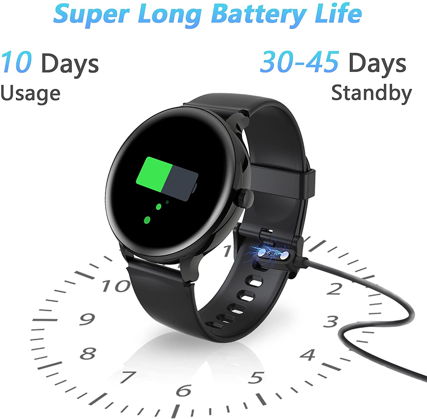 - вЊљ Waterproof Fitness Tracker & Long Battery Life: With 5ATM waterproof smart watch, you can have it on your wrist even in the rain, swimming or surfing. Large capacity and low power consumption design offers longer endurance. One full charge works up to 10 days of usage time and over 30 days standby time.