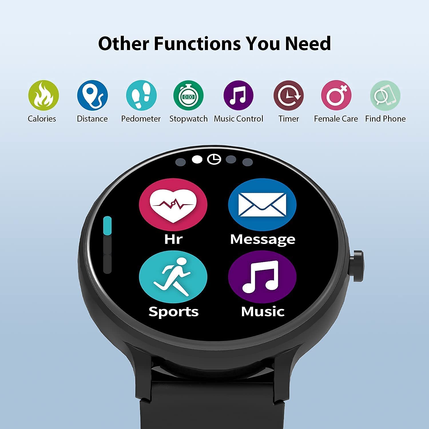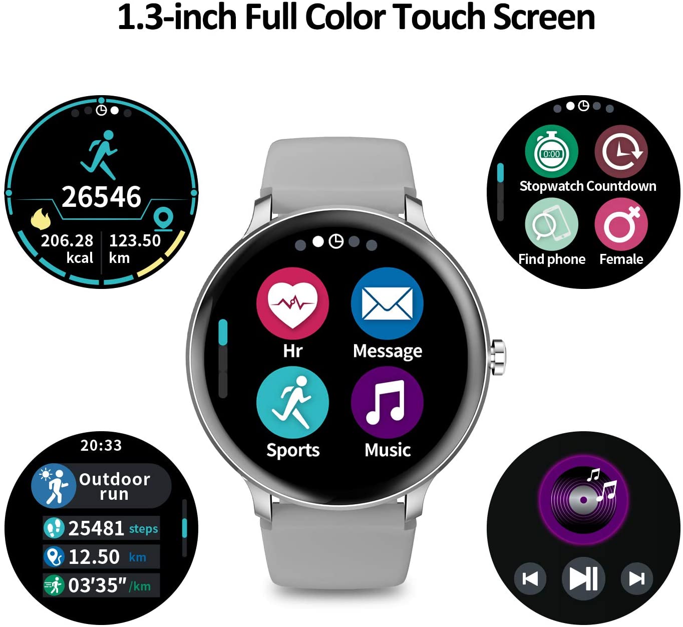 - вЊљ Multifunction Smart Watches: Also features with many practical tools like sedentary reminder, alarm clock, countdown, stopwatch, find phone, female care, etc. on your wrist watch. Fahional design and 1.3 full color touch screen brings the outstanding and more comfortable viewing experience.